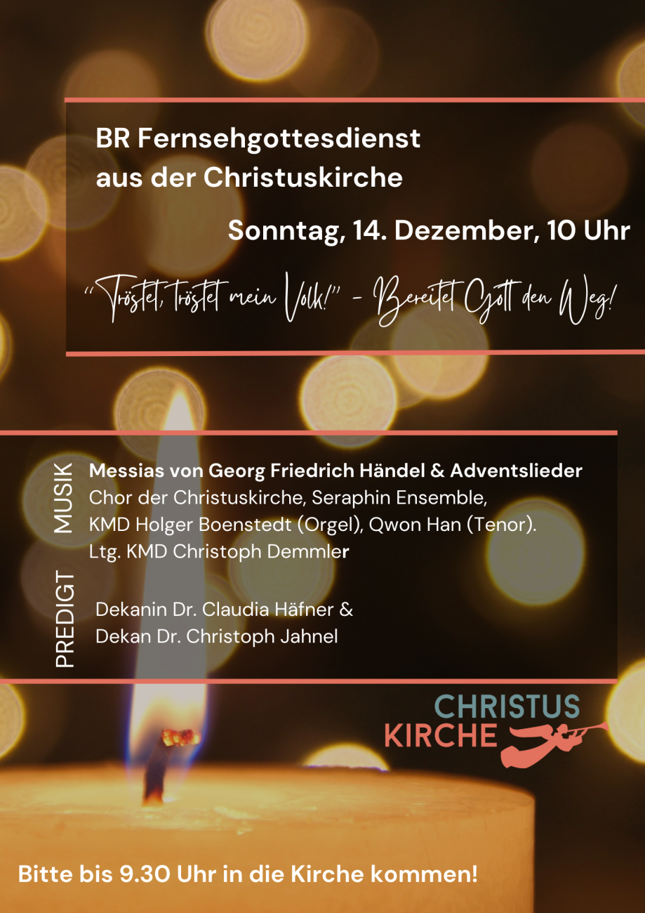 Am 3. Advent (14. Dezember) feiern wir in der Christuskirche einen festlichen Gottesdienst, der im Bayerischen Rundfunk übertragen wird.