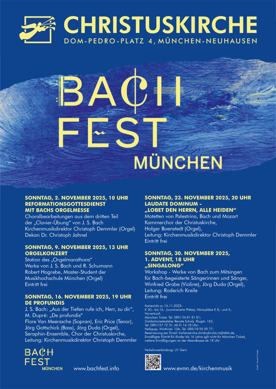 Vom 31. Oktober bis 30. November findet in München das 99. Bachfest der Neuen Bachgesellschaft (NBG) statt. Seit 1901 findet jährlich an wechselnden Orten in Deutschland und in benachbarten Ländern ein „Bachfest der Neuen Bachgesellschaft e.V.“ statt, heuer zum dritten Mal in München. Erstmalig fand das Bachfest der NBG in München 1925 statt. Wir feiern somit auch den 100. Geburtstag des Münchner Bachfestes. Der zweite Vorsitzende der NBG ist vielen in der Christuskirche übrigens kein Unbekannter: Kreuzkantor a.D. KMD Roderich Kreile. Weitere Informationen zum Bachfest München finden Sie unter https://bachfest.info/
